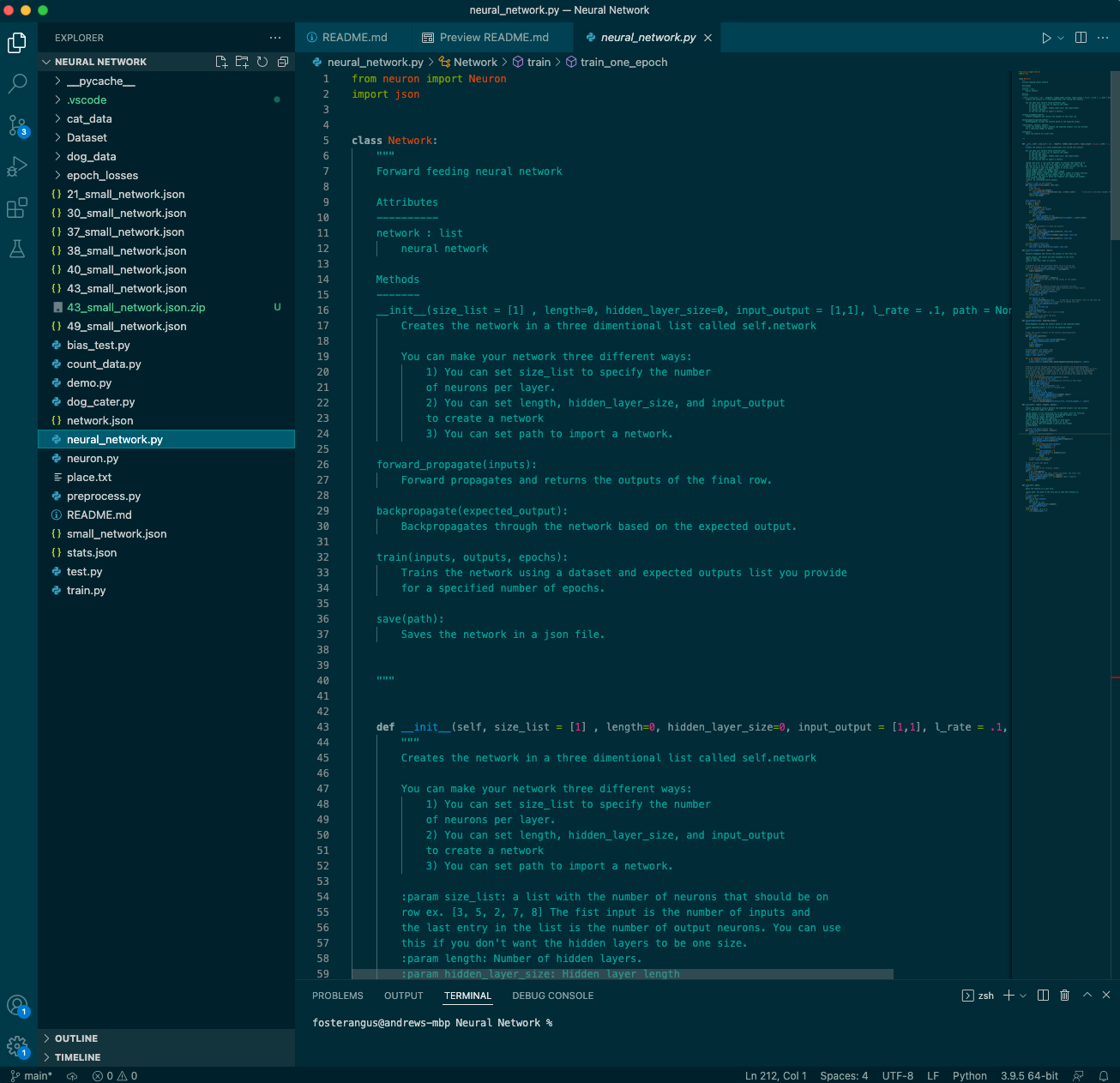 For my CS50 final, I decided to make a neural network from scratch, despite having little idea how one works. I based the workings of my network on a random tutorial explaining how to make a perceptron I found on the internet. There are many problems with my network that decreased efficiency: I could have used matrix multiplication from TensorFlow, I could have back propagated in batches instead of every pass, I could have used a different activation function but I didn’t understand them well, and I could have tried to make a convolutional neural network for picture classification. My goal was to make a network that classified cat and dog photos better than random chance, and I managed to get a stunning 60% accuracy. If you are still interested in my very inefficient neural network, it is very well documented on GitHub.