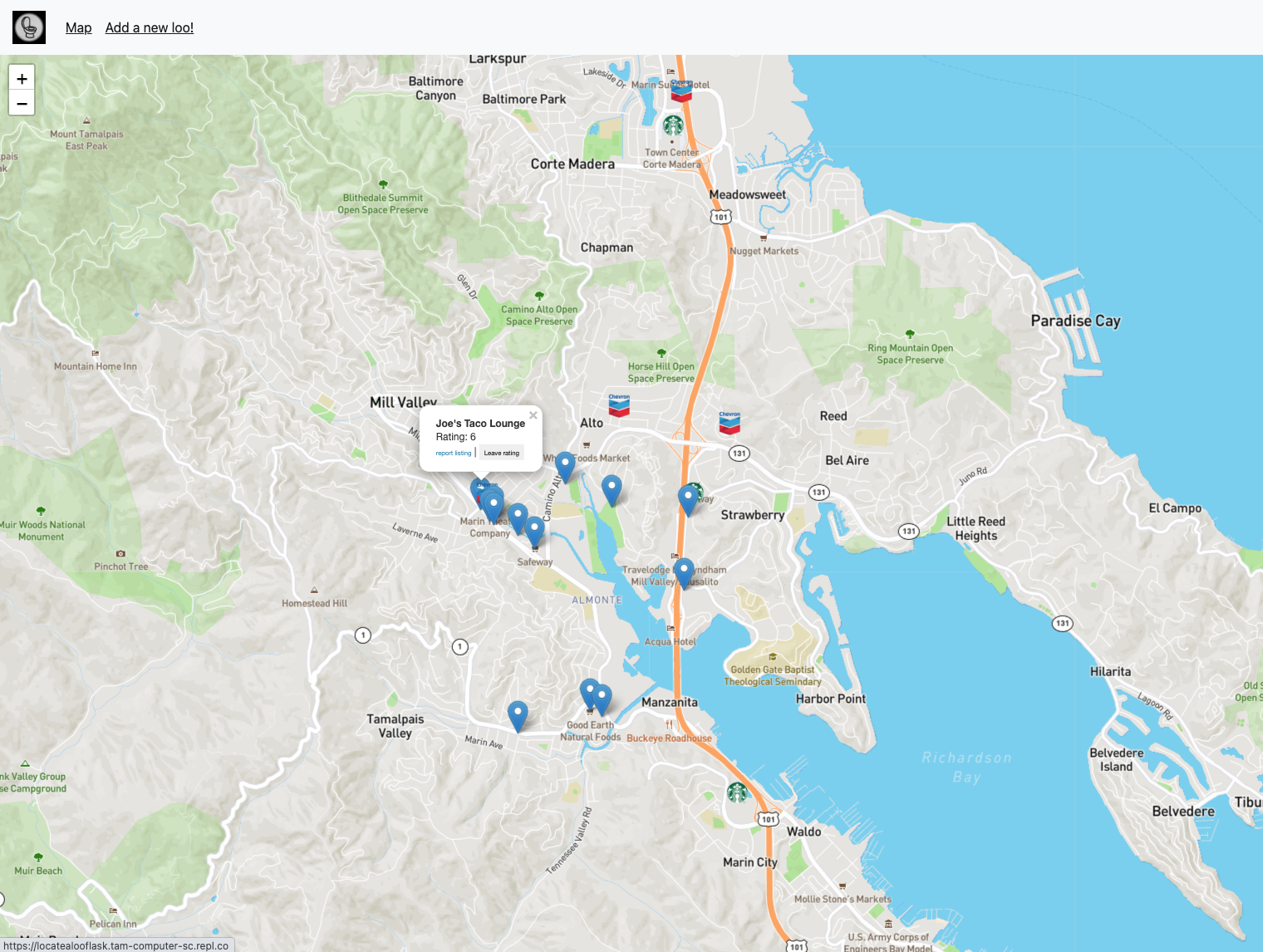 We entered the Gunnhacks 8.0 hackathon. After struggling to find an idea, we settled on an open-source bathroom location service because we liked the name. Locate a Loo is a Flask web app that allows you to add, locate, rate, and report loos. We used leaflet.js to construct the map and the Geoapify API to turn addresses into latitude and longitude. I mainly worked on the backend and the forms.