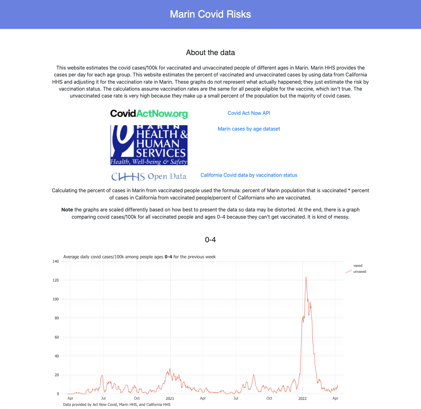 Over the 2021 winter holidays, I decided to make my first web app on my own. I choose to try out Django because Replit recommends its template. The app draws and processes Marin County COVID-19 data from multiple sources along with supplementary California state-wide data to estimate the COVID-19 case rate among vaccinated and unvaccinated people of different ages. The data is displayed using Charting.js. Although the approximations my app makes may not be very accurate, I learned a lot and I learned that I don’t need Django for such a simple project.