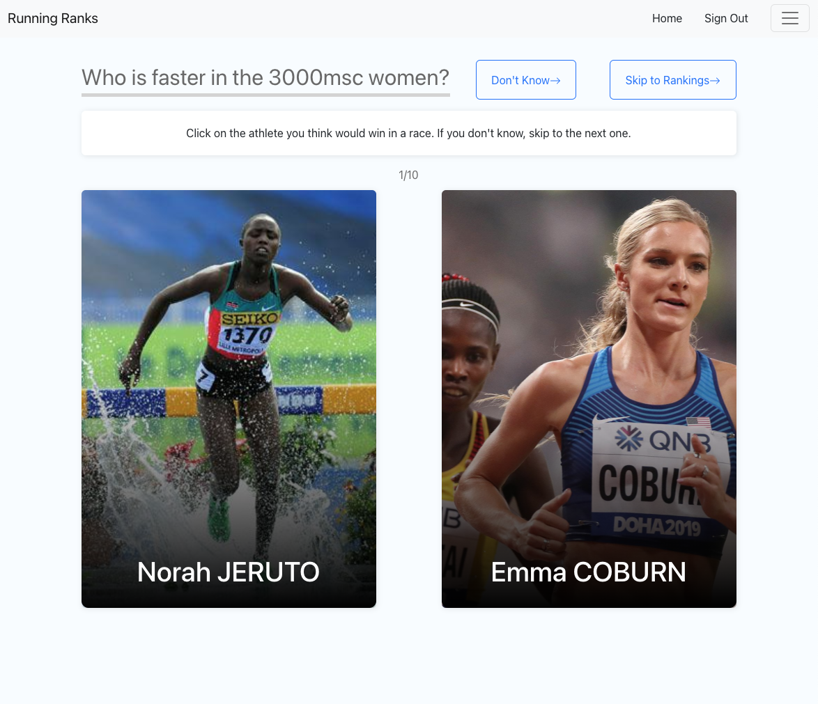 My friend and I created a website called runningranks.firebaseapp.com where you rank the top 12 athletes in the world for each track event (according to the World Athletics ranking system). We ask you to compare athletes two at a time and tell us who you think is faster. The website then aggregates data from all users to rank each of the 12 athletes on the list. We ensure up to date data by refreshing the athlete lists and asking users to rerank weekly. Runningranks.com provides a way for track fans to engage with the sport much the same way as fantasy football or sports betting. This website can give you an idea of the favorites going into a major championship or race and you can use it as a tool when making predictions. I built it using React and a Firebase backend. This website displays some data with Recharts. We also scrape data from worldathletics.org using Beautifulsoup in python.
